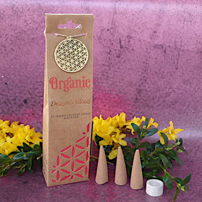 Hochwertige Räucherkegel in recycelter Verpackung mit einem messingfarbenem Blume des Lebens-Metallanhänger.