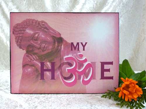 Dieses nostalgisch anmutende Blechschild ist eine schöne Dekoidee für den Eingangsbereich. Abgebildet ist ein ruhender Buddha mit dem Schriftzug "My Home" und dem OM-Zeichen. Das Blechschild ist in folgenden Farben gehalten: Rosa, Lila, Weiss und hat eine Aufhängevorrichtung an der Rückseite.