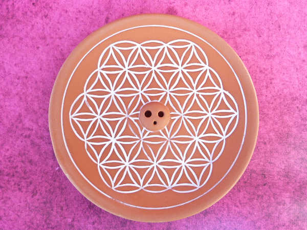Hübscher, runder, terracottafarbener Räucherstäbchenhalter aus Ton mit weißem Motiv Blume des Lebens.