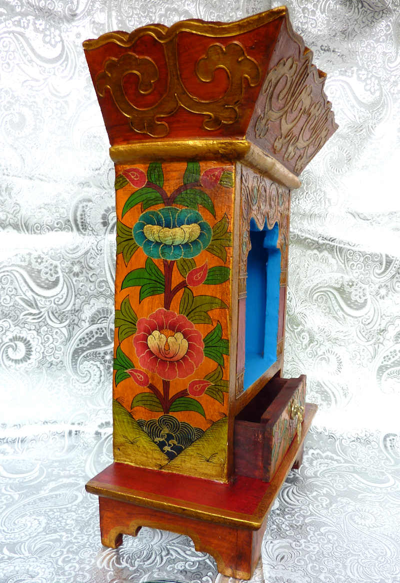 Der Hausaltar hat auch eine flache Schublade, die im unteren Bereich angebracht ist und Utensilien für die Meditation und ähnliche Gelegenheiten aufnehmen kann.