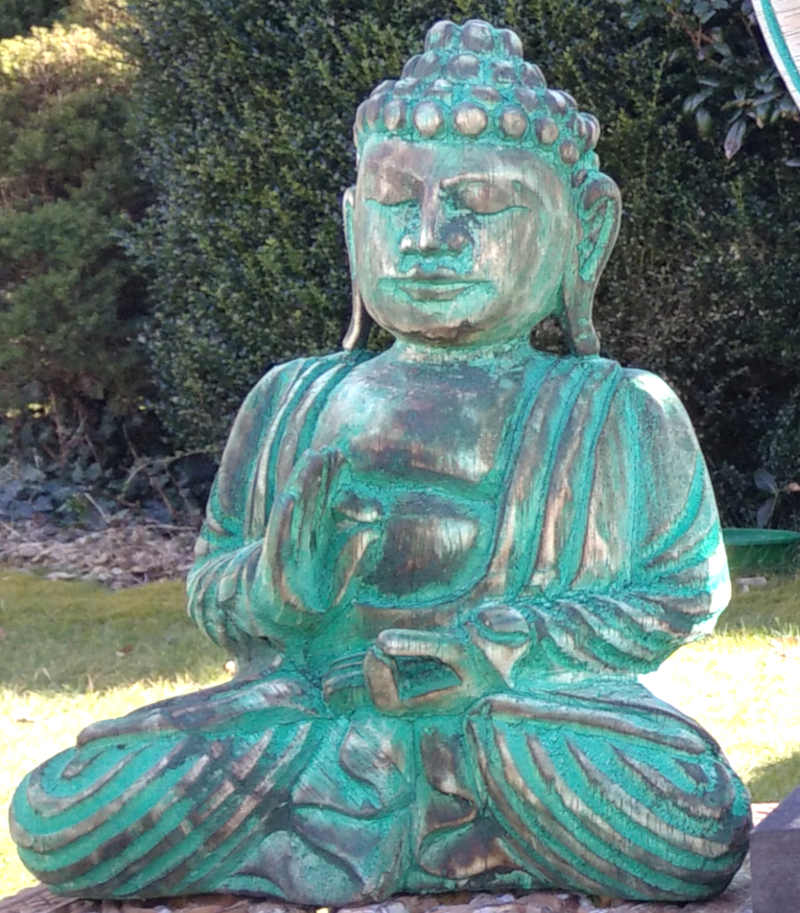 Buddha aus Bali mit Vitarka Mudra & Mandala , Albasia-Holz, antik Grün