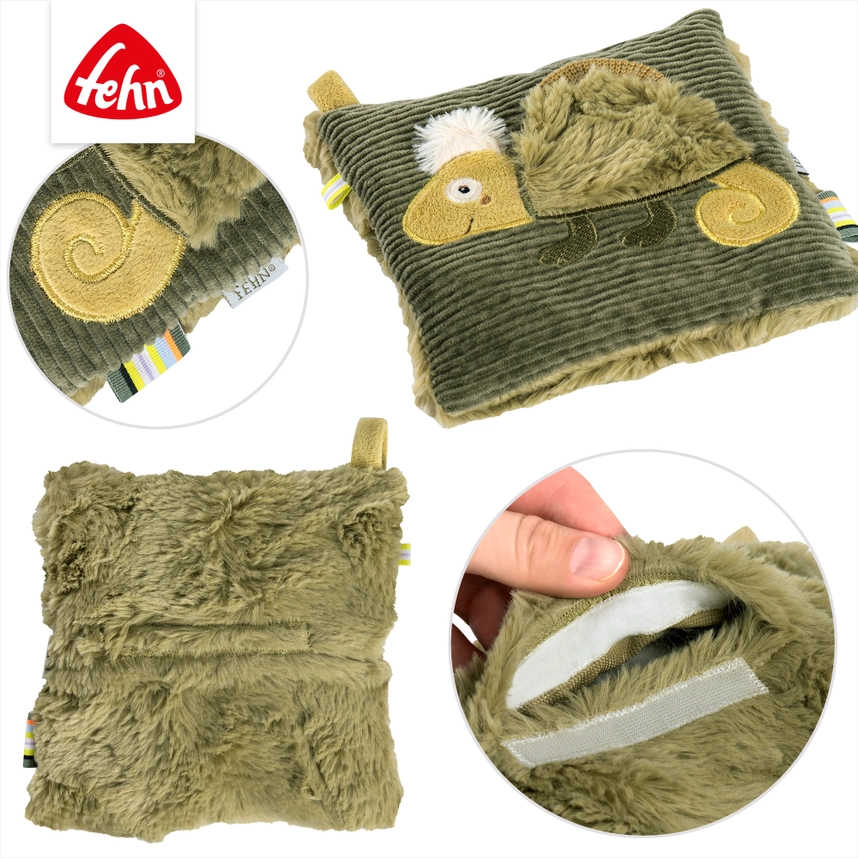 Das niedliche Kirschkernkissen mit dem freundlichen Chamäleon besteht aus dem flauschigen und waschbaren Bezug und einem Inlet mit den Kirschkernen.