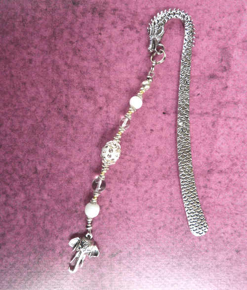 Lesezeichen in Drachenform, silberfarben mit Perlen, Zierelementen und Elefanten-Anhänger