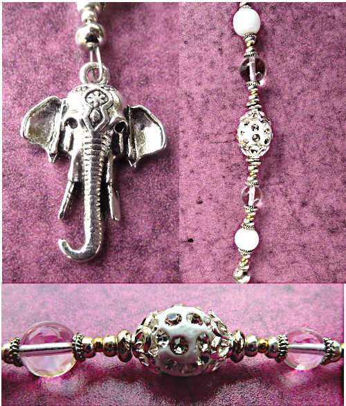 1 silberfarbenes Metall-Lesezeichen in Drachenform, hochwertige Glasperlen in weiss und klar, Metall-Schmuckelementen- und Perlen in silberfarben und ein paar ganz kleine in gold für das gewisse Exra, sowie einem farblich abgestimmten Elefantenkopf-Anhänger.