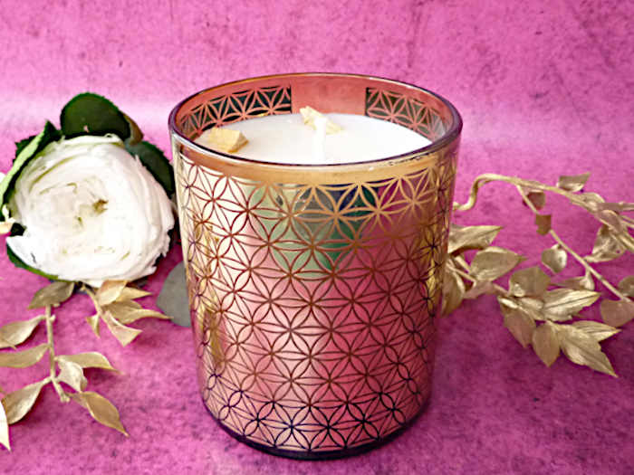 Inhalt: recycelter, sehr wertiger und ansprechender Karton mit Motiv Blume des Lebens, ca 200g handgegossen in einem dekorativen Glasgefäß mit Blume des Lebens-Muster zum Verschenken und Behalten :)