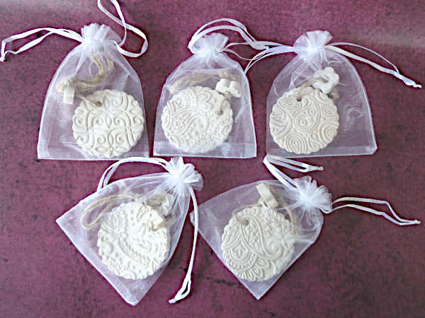 Der Duftstein/Dufthänger wird in einem weißen Organza-Beutelchen geliefert.