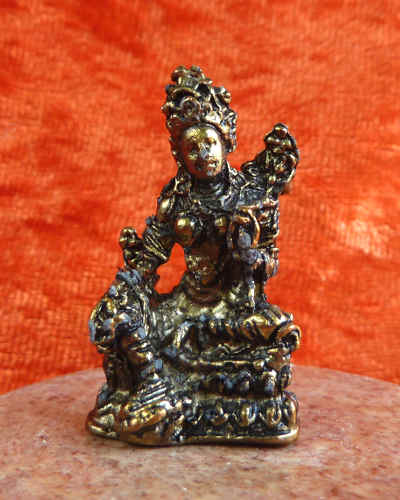 Die grüne Tara verkörpert großes Mitgefühl und schützt vor Angst. Die grüne Tara sitzt mit ausgestrecktem rechten Bein, jederzeit bereit um aufzustehen. Ihre Aufgabe ist es, den Lebewesen dabei zu helfen, nicht mehr leiden zu müssen.
