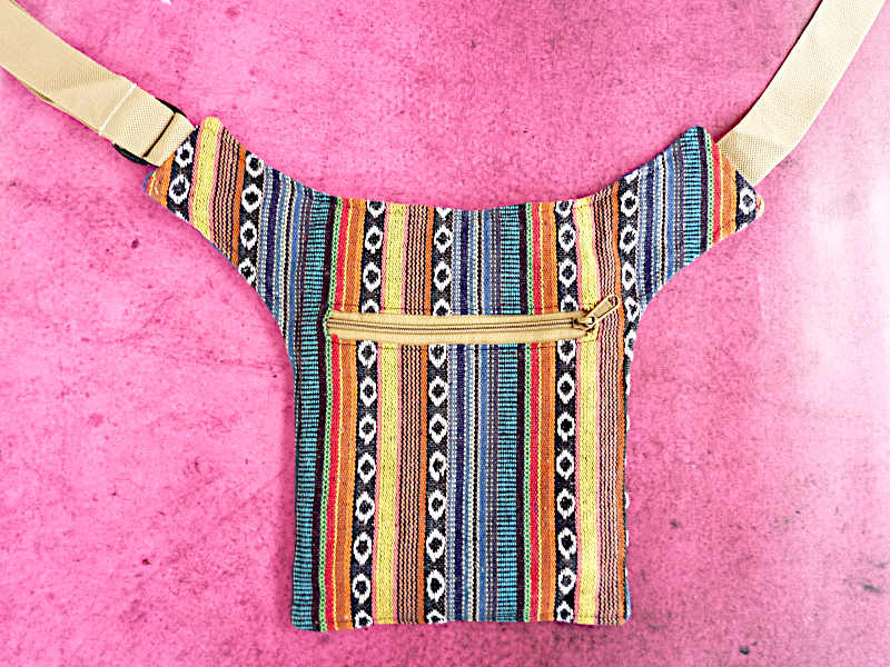 Ein sehr stabiler Gurt mit sicherem Verschluß macht aus der Tasche eine Bauchtasche - praktisch für unterwegs.