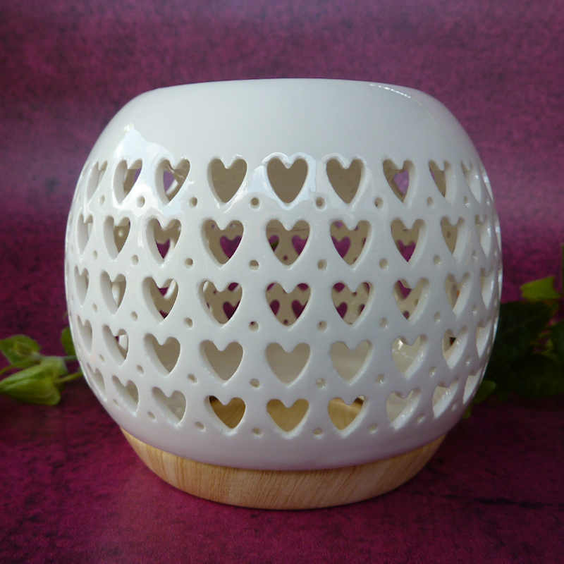 Die Duftlampe ist 2-teilig. Beide Teile bestehen aus Keramik. Der Teller für das Teelicht ist holzfarben und der kugelförmige Korpus ist weiss und übersät mit kleinen, herzförmigen Löchern.