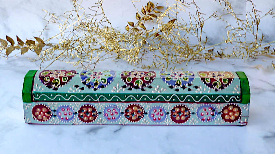Diese indische, türkisbunte Räucherstäbchenbox ist ein echter Hingucker und eine schöne Geschenkidee.