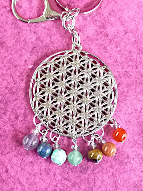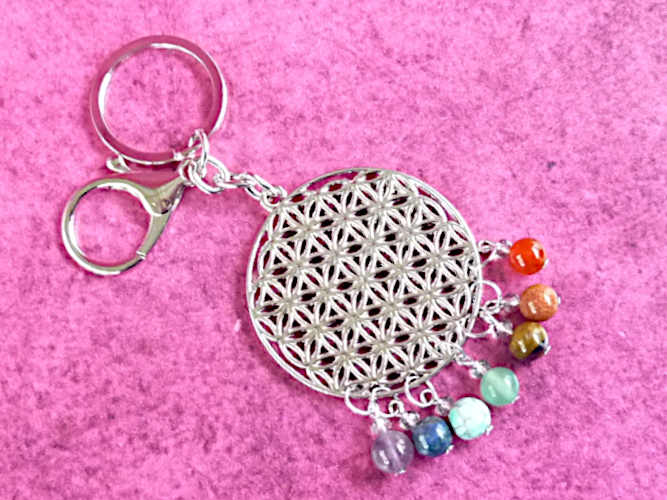 Verziert ist der Schlüsselring mit einem großen Blume-des-Lebens-Anhänger (Durchmesser ca. 5cm) und 7 verschiedenfarbigen Edelstein-Perlchen.