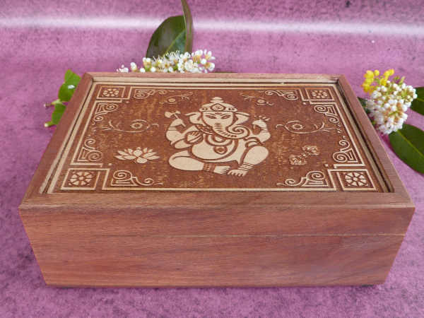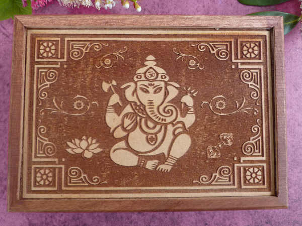 Diese hübsche Dose ist mit einem Ganesha und verschiedenen Ornamenten verziert und innen mit schwarzem Samt bezogen.