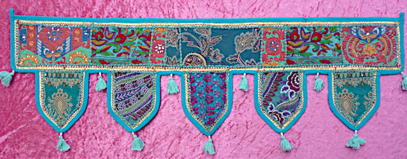 Prächtiger indischer Thoran Türbehang Wandbehang, 5 Lamellen, türkisblau-bunt