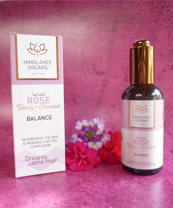 Himalaya's Dreams Rose / Balance Körper- und Gesichtsöl enthält eine Mischung aus nährenden, feuchtigkeitsspendenden und beruhigenden Ölen, die täglich verwendet werden können. Es hat eine feuchtigkeitsspendende Wirkung auf die Haut und hilft, feine Linien und Fältchen zu glätten. Rosenblätter spenden Feuchtigkeit und halten die Haut weich. Mandel, Weizenkeime und Vitamin E pflegen die Haut. Karottenöl schützt die Haut vor schädlichen UV-Strahlen.