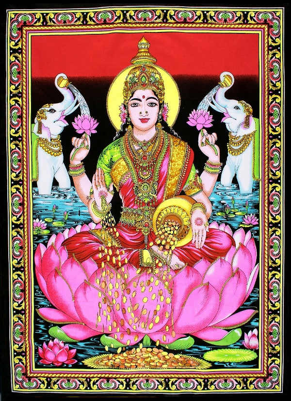 Göttin Lakshmi ist die hinduistische Göttin des Glücks und der Schönheit, nicht nur Spenderin von Reichtum sondern auch von geistigem Wohlbefinden, von Harmonie, von Fülle und überfluss, Beschützerin der Pflanzen. Sie ist die Shakti, die erhaltende Kraft des Vishnu, und dessen Gemahlin.