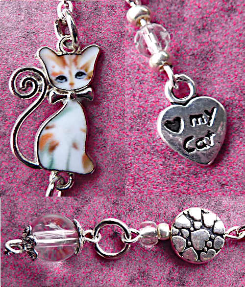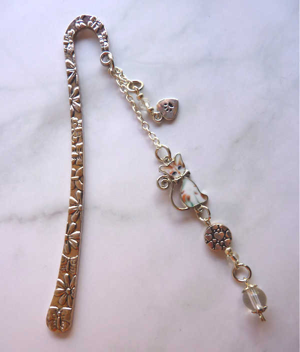 1 silberfarbenes, gemustertes, Metall-Lesezeichen, eine klare Glasperlen, Metall-Kettchen und Schmuckelemente, sowie einem KatzenanhängerAnhänger. Zusätzlich ist ein Minikettchen angebracht, mit Miniperlen und einem kleinen Herzanhänger welcher auf der einen Seite mit einer Katzenpfote versehen ist und aus der anderen mit einem kleinen Herzchen neben dem Schriftzug "my cat"