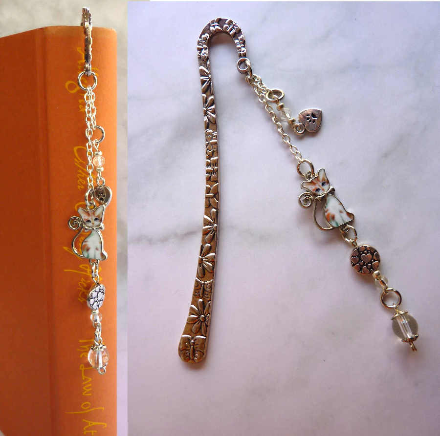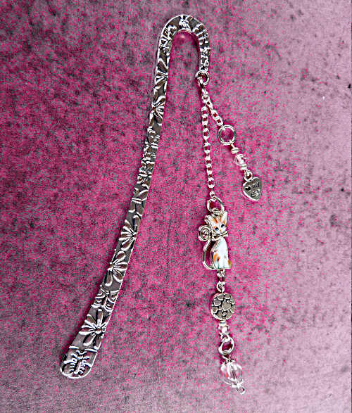 Lesezeichen Katzenliebe mit Deko aus Perlen, Zierelementen und Anhänger Katze