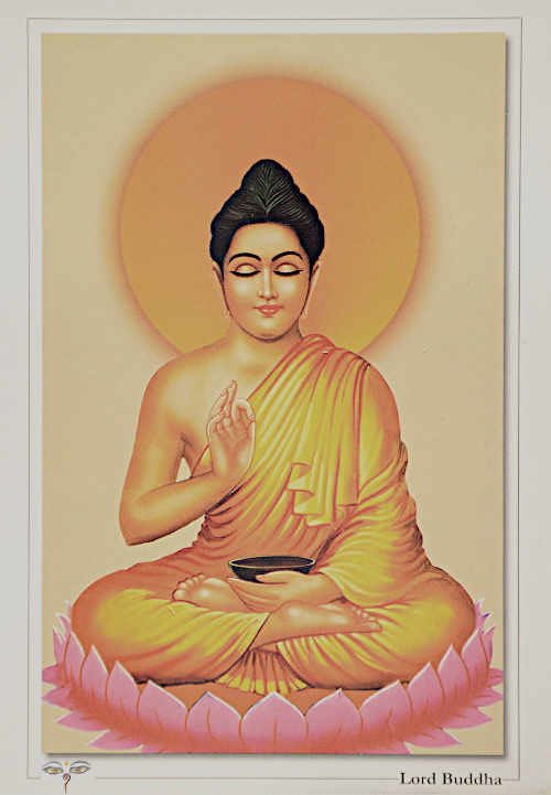 Hübsche Postkarte aus Nepal mit Lord Buddha auf dem Lotusthron Text auf der Rückseite: "Gaumtam Buddha, theEnlightened One, the Apostle of Peace from Asia." Übersetztung: "Gautam Buddha, der Erleuchtete, der Friedensapostel aus Asien."