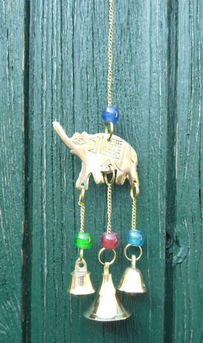 Bezauberndes Messingmobile mit einem Elefanten, 4 bunten Perlen und 3 Glöckchen.