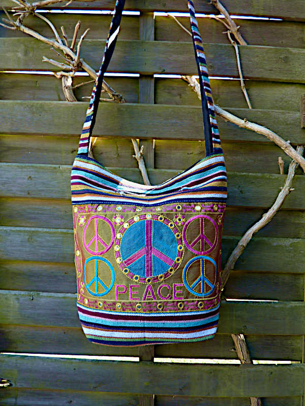 In Handarbeit gefertigte, indische Stoffumhängetasche aus Baumwolle mit buntem Streifenmuster, auf der Vorderseite zusätzlich aufwändig bestickt mit 5 Peace Zeichen, dem Schriftzug "Peace" und kleinen Spiegelchen.