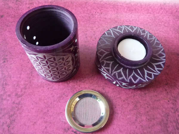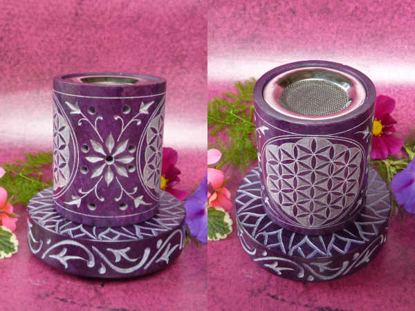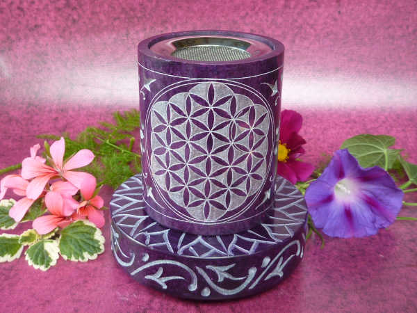 Siebgefäß Räucherstövchen Blume des Lebens aus violettem Speckstein