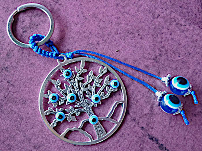 Verziert ist der Schlüsselring mit einem Baum-des-Lebens-Anhänger (Durchmesser ca. 5,5cm) mit 7 kleinen Nazar-Perlen und 2weiteren, größeren blau-weissen Nazar-Perlen.
