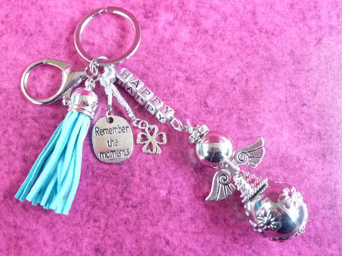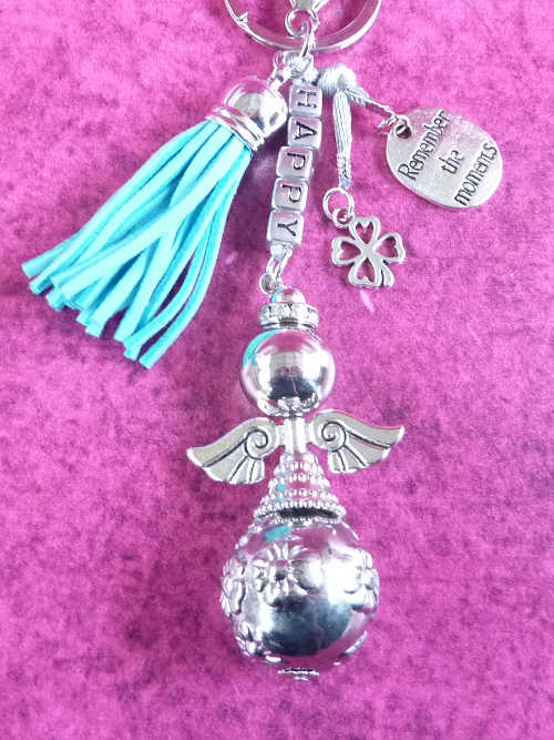 Verziert ist der Schlüsselring mit einem großen Engel-Anhänger (ca. 6x3,5 cm), türkisen Lederschnüren, 5 quadratischen Zierperlen mit dem Schriftzug "Happy", 1 silberfarbenr Anhänger "remember the moments" und 1 Kleeblatt.