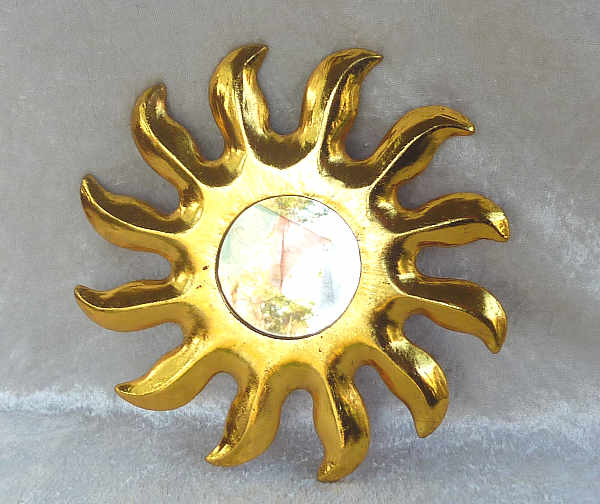 Die Sonne ist aus Holz und von Hand mit Goldfarbe bemalt. Der Spiegel hat eine Aufhängevorrichtung auf der Rückseite.