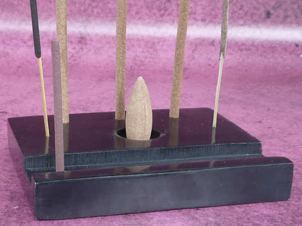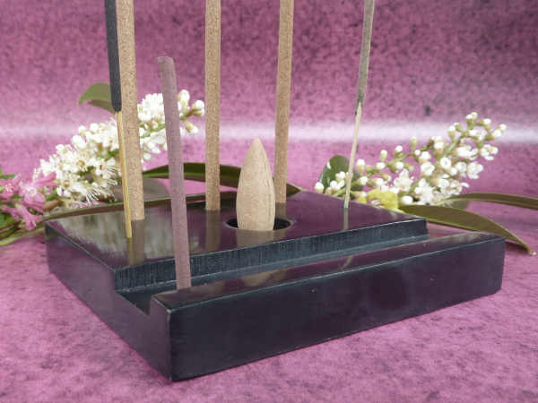 Schwarzer Speckstein Räucherstäbchenhalter für dicke und dünne Stäbchen und Räucherkegel