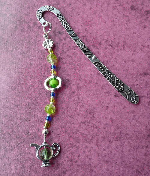 1 silberfarbenes, gemustertes, Metall-Lesezeichen, hochwertige Glasperlen in blau und grün, Metall-Schmuckelemente, sowie einem farblich abgestimmten Anhänger Teekanne.