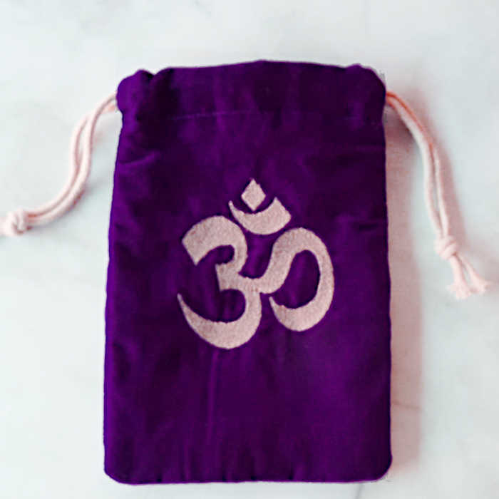 Geschenkbeutel Samtbeutel in tiefdunklem Lila, innen mit schwarzem Stoff gefüttert, Außen mit einer glänzenden OM-Applikation.