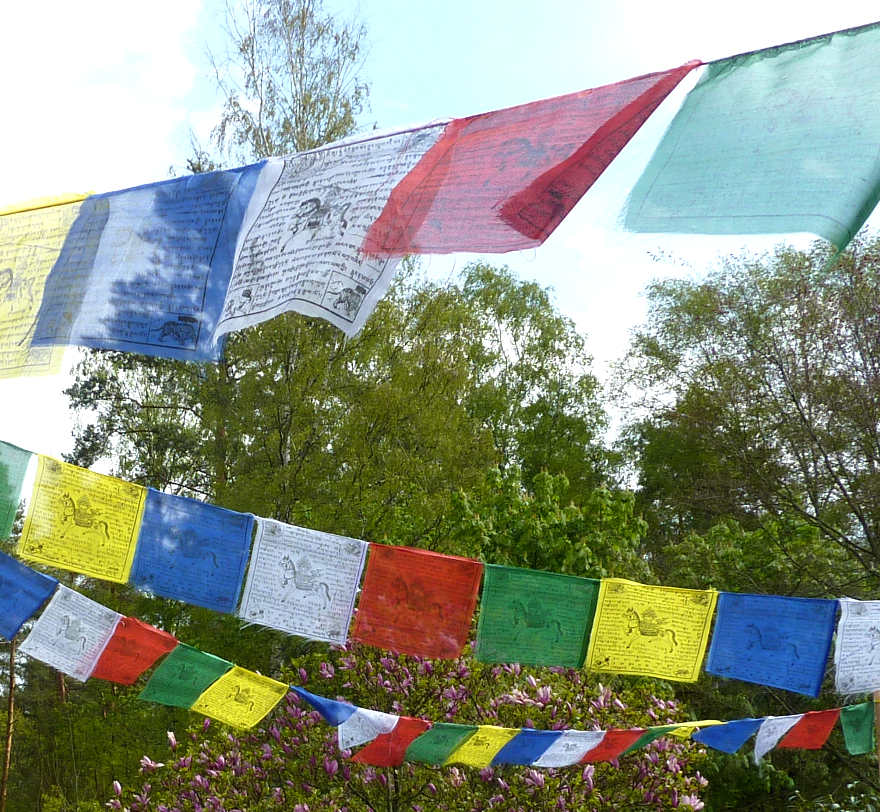 Die fünf Farben symbolisieren u.a. die 5 Elemente und die Himmelsrichtungen. Auf jeder Einzelfahne ist ein tibetisches Mantra (Gebet) aufgedruckt. Dem Wind die Gebete anvertrauen... ...