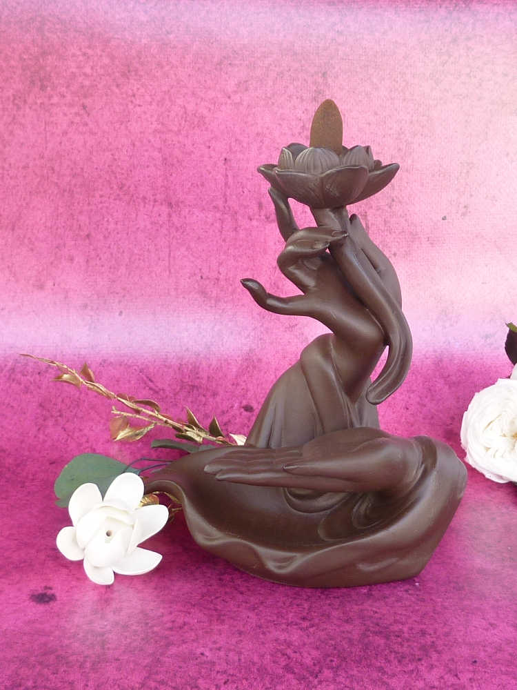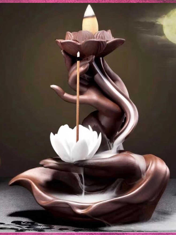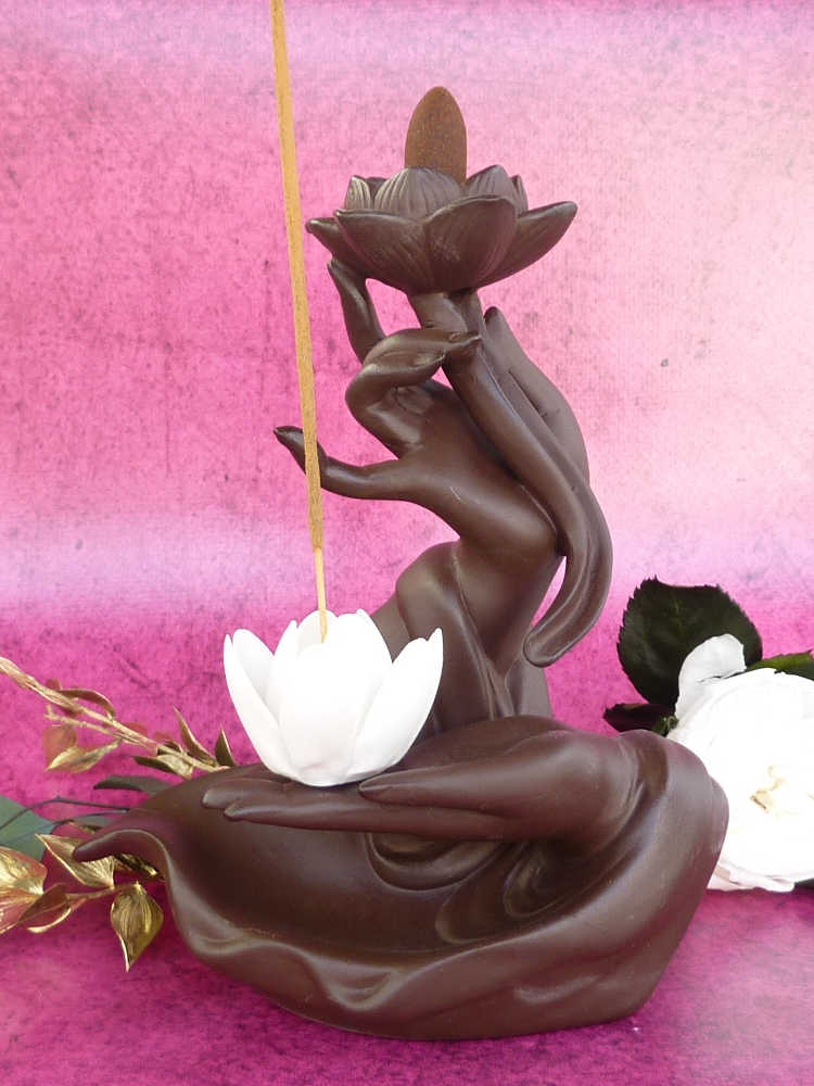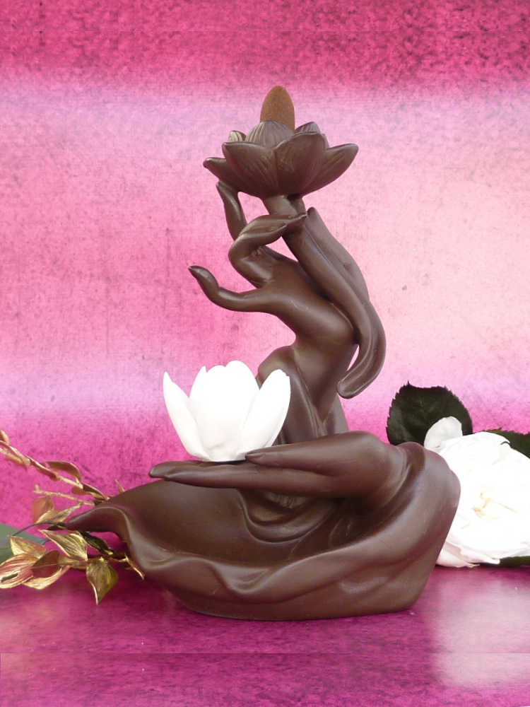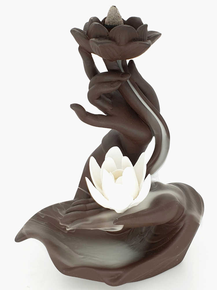 Zauberhafter, meditativer Rückfluss (Backflow) Wasserfall Weihrauchbrenner mit 2 Händen und einer Blume und einer weissen Lotusblüte.
