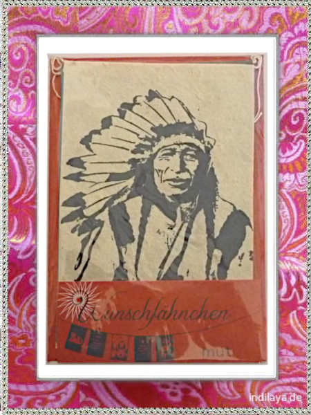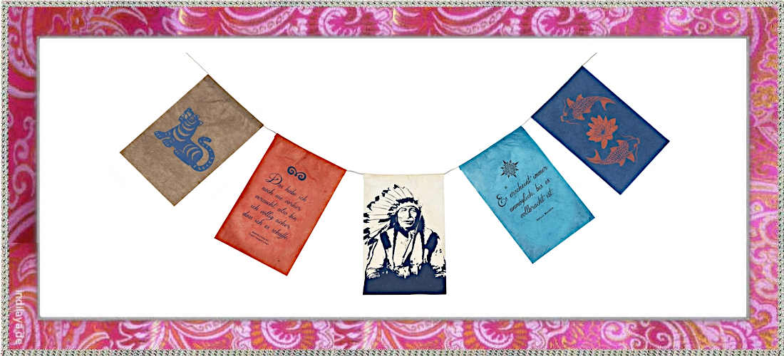 Wunschfähnchen mit asiatischem Tiger, Sioux-Mann mit Federschmuck, Koi-Karpfen.